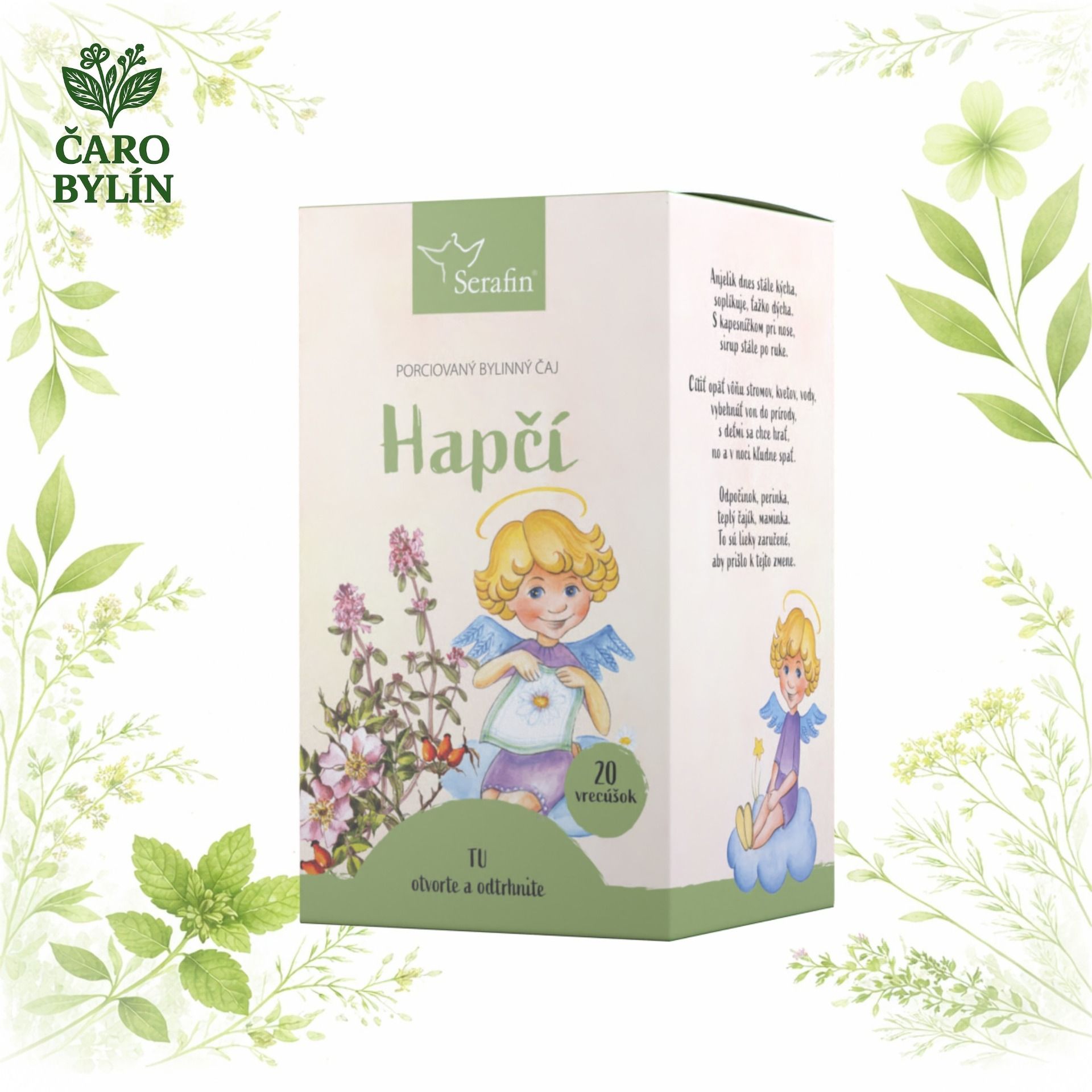 viacSerafínkov čaj – Hapčí je jemná bylinná zmes vytvorená špeciálne pre deti pri prvých príznakoch nachladnutia. Obsahuje starostlivo vybrané bylinky, ktoré upokojujú podráždené dýchacie cesty, uľahčujú dýchanie a podporujú prirodzenú obranyschopnosť organizmu.